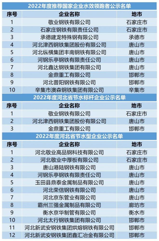 近日,河北省工業(yè)和信息化廳網(wǎng)站公示2022年國家級(jí)水效領(lǐng)跑者遴選推薦和省級(jí)節(jié)水型企業(yè)、節(jié)水型園區(qū)擬入選名單。其中,10家鋼企入選2022年度推薦國家企業(yè)水效領(lǐng)跑者名單,3家企業(yè)入選2022年度河北省節(jié)水標(biāo)桿企業(yè)名單,12家企業(yè)入選2022年度河北省節(jié)水型企業(yè)名單。