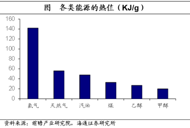 從應用端來看,氫能的優(yōu)勢在于高效、應用廣泛。一是高效,相對于其他常見能源,氫氣燃燒的熱值更高,能達到142KJ/g,遠高于其他能源,從而能夠提升效率。二是氫氣的應用廣泛,既可以用作燃料電池發(fā)電,應用于汽車,船舶和航空領域,也可以單獨作為燃料氣體或化工原料進入生產(chǎn),同時還可以在天然氣管道中摻氫燃燒,應用于建筑供暖等。目前在已經(jīng)規(guī);瘧玫哪茉粗校瑑H有石油能具備供熱、供電、交通燃料等多種功能,而氫氣無疑又是一種具有多種能源特性、適用多種場景的優(yōu)質能源。