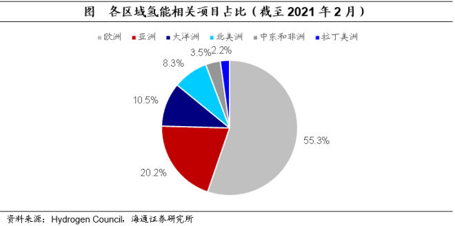 目前我國也是全球發(fā)展氫能速度較快的國家之一,在截至2021年初全球投資的氫能項目中,我國占比較高。據(jù)國際氫能協(xié)會統(tǒng)計,全球氫能產(chǎn)業(yè)鏈上已建成、在建和規(guī)劃項目共228個,主要分布在歐洲、澳大利亞、亞洲、中東、智利等國家和地區(qū)。從地域分布來看,預計歐洲的投資份額最大(約45%),其次是亞洲,而中國占亞洲總投資的50%左右,居首位。