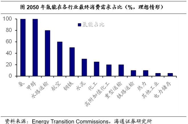 對比國際上的路線圖,我們預計實際增速可能高于此,或將在6%左右。國際能源署在《2050年凈零排放——全球能源部門路線圖》中預測,為實現(xiàn)在2050年碳中和,全球對氫氣的需求將從2020年的0.87億噸增長至5.3億噸,年均增長6.2%。而國際氫能委員會在2021年11月的報告《凈零氫能報告》中也提到,為實現(xiàn)碳中和、全球降溫1.5度的目標,到2050年,全球對氫氣的需求為6.6億噸,占全球最終能源需求的22%,年均增速達7.0%。這兩個目標均較國內(nèi)機構要更積極,也就是說,如果碳中和的進程需要加快,氫能源行業(yè)發(fā)展也會進一步提速。