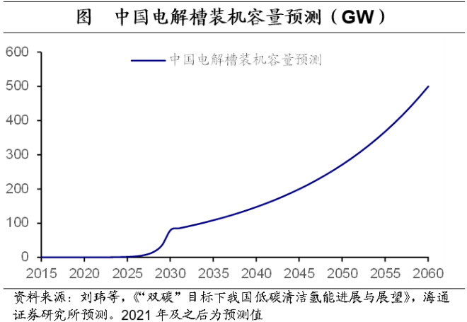 具體地,我們按產(chǎn)業(yè)鏈的上中下游分別尋找未來的焦點賽道。從生產(chǎn)端看,核心在于如何低成本制取零碳排放的綠氫,與此相關的賽道包括電解槽、催化劑、碳捕集和封存(CCUS)等。其中,可以從低碳電力和水中產(chǎn)生干凈的氫氣,是未來增加綠氫供給的核心。近年來我國電解制氫項目及裝機容量增速較快,從2015年的1.63MW,增至2020年的23.47MW,年均增速高達70.5%。要實現(xiàn)到2030年和2060年綠氫占比達13.5%和76.9%的目標,分別需要部署電解槽裝機80GW和500GW,這意味著在2020-2030年間要保持年均125.6%的超高增速,而在2030年后,年增速逐步趨于正常。