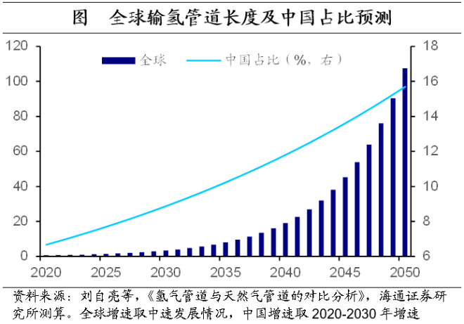 在儲運的基礎設施上,氫氣管網(wǎng)建設有較大的發(fā)展空間。工業(yè)氫氣運輸主要以管道形式為主,低壓管道運氫適合大規(guī)模、長距離的情況,在未來有極大的需求。全球在2020年共建成輸氫管道6000公里,其中,中國僅有400公里,占比為6.7%。而根據(jù)劉自亮等的研究,預計在中速發(fā)展的情況下,到2050年全球將建成長距離和短距離輸氫管道7.5萬和100萬公里,年均增速約為18.9%。中國預計到2030年將建成氫氣管道3000公里,年均增速為22.3%,較全球增長更快。