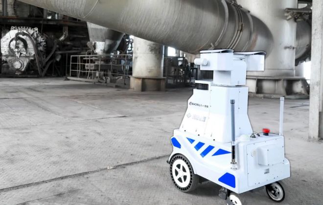 八鋼歐冶爐巡檢機(jī)器人“小白”在高爐爐頂進(jìn)行巡檢作業(yè)。(姚海山 攝)