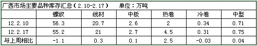 桂林等市場庫存總量4.8萬噸,增加0.1萬噸,其中螺紋鋼3.5萬噸,持平;線材、盤螺1.3萬噸,增加0.1萬噸。