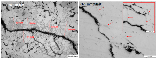 在金相顯微鏡下發(fā)現(xiàn)了形貌截然不同的兩類裂紋,如圖9所示。第一類裂紋靠近于鑄坯表面,裂紋寬度較寬,附近存在120~150μm的脫碳層,說(shuō)明該類裂紋形成于高溫階段。第二類裂紋為細(xì)小裂紋,存在于整條裂紋的末端,沿晶界分布,裂紋附近無(wú)脫碳現(xiàn)象,說(shuō)明該類裂紋可能形成于低溫階段。當(dāng)鑄坯角部溫度降至A3溫度以下時(shí),沿原奧氏體晶界析出先共析鐵素體膜和沉淀出碳氮化物粒子,大幅降低晶界強(qiáng)度,若此時(shí)鑄坯受到機(jī)械應(yīng)力(如矯直力),則易形成第二類裂紋。