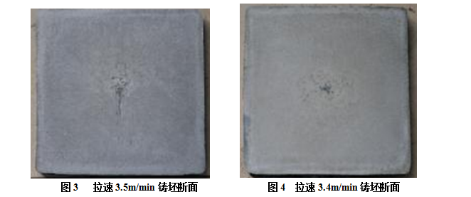 在拉速提升后,平均拉速3.2-3.5m/min時,中心裂紋、疏松、縮孔等單一缺陷最高為2.5級,鑄坯低倍缺陷總級數(shù)<4.5級。其中在拉速3.5m/min時,鑄坯缺陷總評級為3.0,鑄坯質(zhì)量正常。