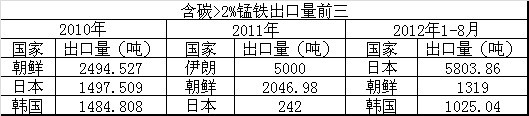 2012年1-8月共出口錳鐵17245.867噸,比去年同期減少約37.1%。1-8月共出口含碳>2%錳鐵9051.283噸,比去年同期約增加29.2%。1-8月含碳≤2%錳鐵比去年同期約減少59.9%。