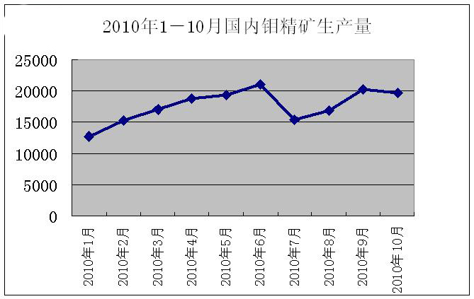 據(jù)中國(guó)有色金屬工業(yè)協(xié)會(huì)統(tǒng)計(jì)數(shù)據(jù),2010年10月國(guó)內(nèi)鉬精礦產(chǎn)量為19705噸,較9月份20252噸減少547噸,環(huán)比降2.7%;從9月底開(kāi)始至11月初,河南地區(qū)嚴(yán)重的限電導(dǎo)致河南地區(qū)鉬精礦產(chǎn)量環(huán)比減少3000噸左右,而其他地區(qū)生產(chǎn)量略有增加。