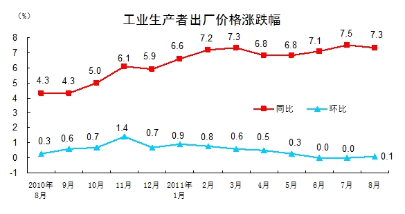 2011年8月份,全國工業(yè)生產(chǎn)者出廠價格比上月上漲0.1%,比去年同月上漲7.3%。工業(yè)生產(chǎn)者購進價格比上月上漲0.2%,比去年同月上漲10.6%。2011年1—8月,工業(yè)生產(chǎn)者出廠價格平均同比上漲7.1%,工業(yè)生產(chǎn)者購進價格平均同比上漲10.4%。
