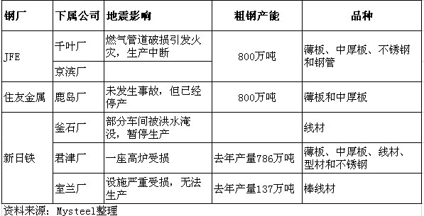 東北地區(qū)和關(guān)東地區(qū)還有其他小鋼廠,估計(jì)都會(huì)受到一定影響,初步測算本次地震最少影響了日本3000萬噸的鋼鐵產(chǎn)能。