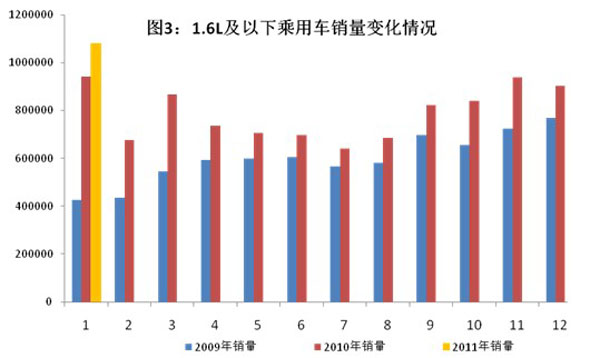 1月,1.6升及以下乘用車銷售107.91萬輛,同比增長14.67%,較乘用車市場16.17%的同比增速低1.5個百分點;1.6升及以下乘用車占乘用車銷售市場的70.6%,比2010年提高1.83個百分點。