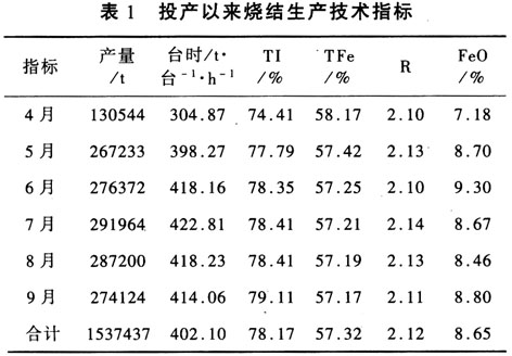 邯寶煉鐵廠燒結(jié)車間l#360 m2燒結(jié)機于2008年3月26日熱負荷試車成功并投產(chǎn),向1#3 200 m2高爐供料。投產(chǎn)一個月來,燒結(jié)礦轉(zhuǎn)鼓指數(shù)平均為74.41%,不能很好滿足3200m3級高爐對爐料質(zhì)量的需求。特別是該高爐4月18日投產(chǎn)以來,隨著高爐強化冶煉程度的提高,對燒結(jié)礦質(zhì)量也提出了越來越高的要求,不僅成分要求穩(wěn)定,而且對其強度和粒度組成的要求更為嚴格。為了滿足高爐精料入爐的冶煉生產(chǎn)需要,扎實提高燒結(jié)礦質(zhì)量,2008年5月邯寶公司組織了攻關(guān)隊,開展了“提高燒結(jié)礦轉(zhuǎn)鼓強度”的攻關(guān)活動。通過一系列的技術(shù)和管理攻關(guān),5~8月燒結(jié)礦轉(zhuǎn)鼓指數(shù)平均達到78.24%,9月達到了79.11%,滿足了大高爐冶煉對燒結(jié)礦強度的要求。表1為1#360 m2投產(chǎn)以來燒結(jié)生產(chǎn)技術(shù)指標。