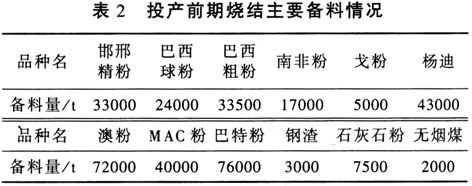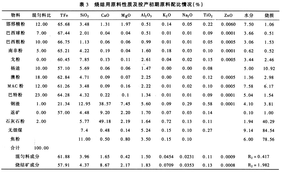 邯鋼沒有自己的礦山,原料均為外購且吃的是“百家飯”,邯寶煉鐵廠在360 m2燒結(jié)機投產(chǎn)前結(jié)合邯鋼自身特點,為燒結(jié)機投產(chǎn)儲備了大量原料(如表2所示)。按照備料情況和各種原料的物化性質(zhì)),并結(jié)合老區(qū)生產(chǎn)經(jīng)驗數(shù)據(jù),確定了燒結(jié)機投產(chǎn)初期配比(見表3)。