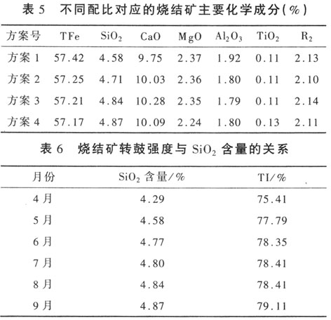 由表5可以看出,由于戈粉SiO2含量較高,它的配人使燒結(jié)礦中SiO2含量有較大提高,從而達到提高燒結(jié)礦SiO2含量的目的。以上配比方案攻關(guān)表明,通過適當提高SiO2含量高的礦種配比的方法來提高燒結(jié)礦的SiO2含量,能改善燒結(jié)礦的強度指標。表6所示為投產(chǎn)以來燒結(jié)礦轉(zhuǎn)鼓強度與SiO2含量的關(guān)系。