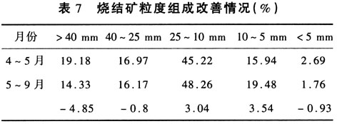 自2008年5月開展技術(shù)攻關(guān)以來,通過采取一系列措施,燒結(jié)礦轉(zhuǎn)鼓強度等主要技術(shù)經(jīng)濟指標有了明顯改善(見表1),同時燒結(jié)礦粒度組成也得到明顯改善(見表7)。