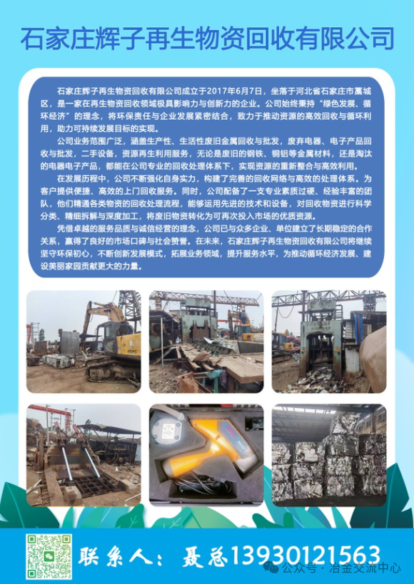 石家莊輝子再生物資回收有限公司成立于2017年6月7日,坐落于河北省石家莊市藁城區(qū),是一家在再生物資回收領域極具影響力與創(chuàng)新力的企業(yè)。公司始終秉持“綠色發(fā)展、循環(huán)經濟”的理念,將環(huán)保責任與企業(yè)發(fā)展緊密結合,致力于推動資源的高效回收與循環(huán)利用,助力可持續(xù)發(fā)展目標的實現。