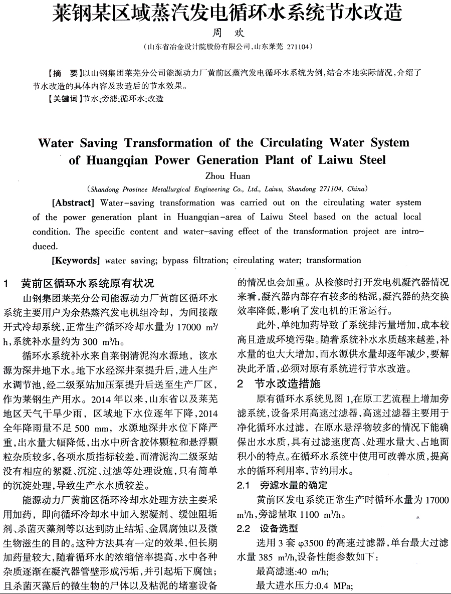 萊鋼某區(qū)域蒸汽發(fā)電循環(huán)水系統(tǒng)節(jié)水改造